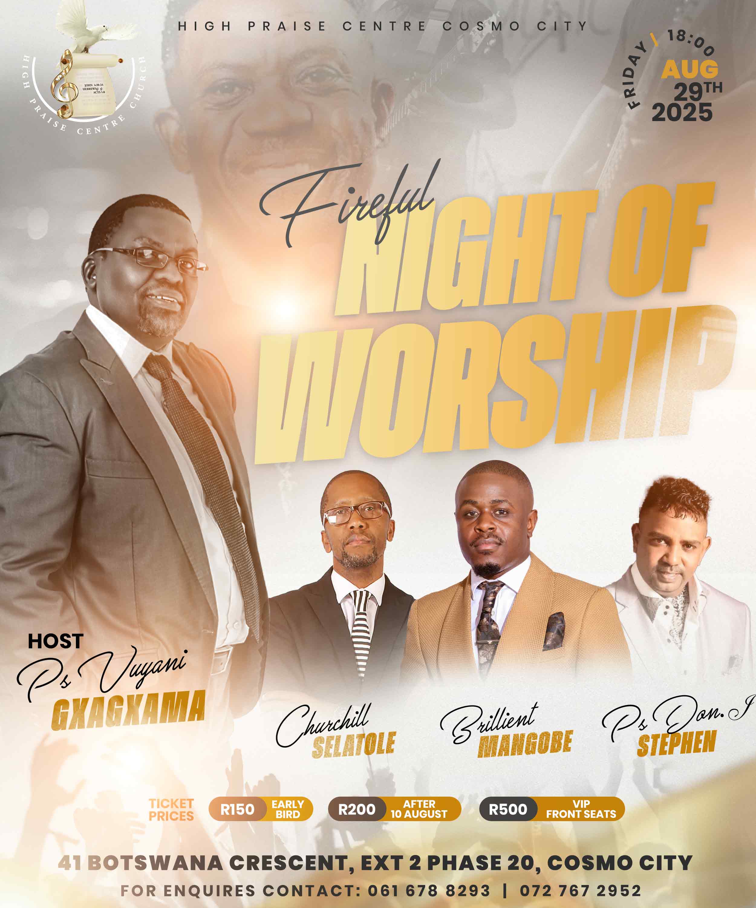 The Fireful Night of Worship 2025 will take place on Friday, 29 August 2025 at High Praise Centre, Cosmo City. This event promises a powerful evening of worship, praise, and fellowship, bringing together believers from across the city. Expect live worship, uplifting messages, and a spirit-filled atmosphere that will inspire, renew, and strengthen your faith.